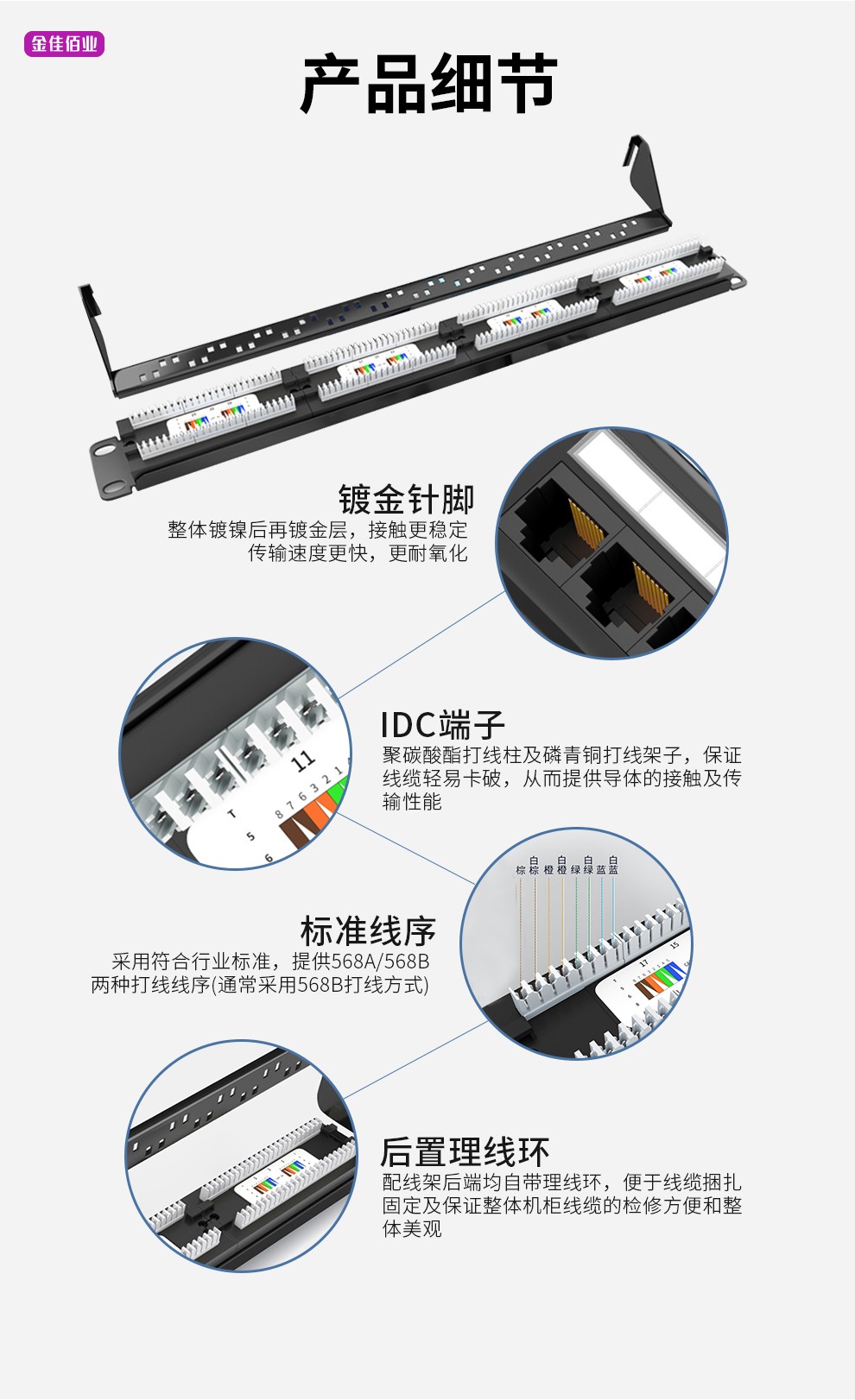 3. 標準線序,所有插座都具備T568A和T568B兩種線序,適用所有19英寸標準機柜,后置理線環