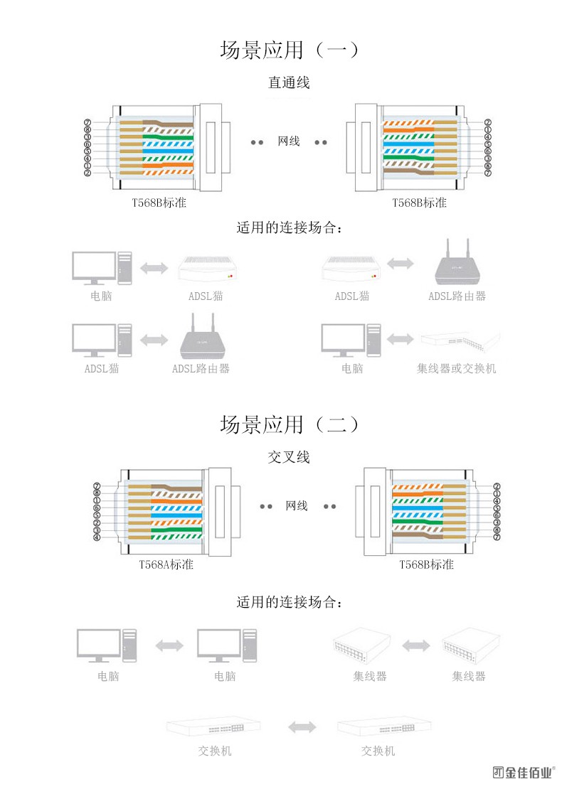 b.當雙絞線兩端分別使用不同的標準,為交叉線,用于連接計算機與計算機,交換機與交換機等;