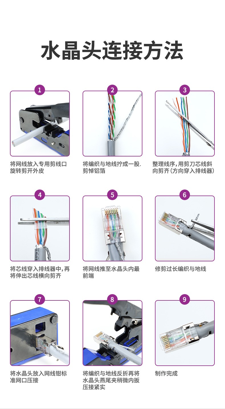 4. 固線燕尾夾設計 鉚壓網線牢固不松動,增強抗拉能力