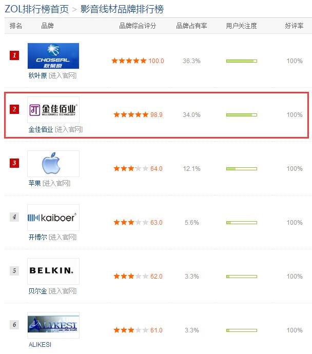 旗下電腦周邊線材高端品牌“金佳佰業(yè)”,憑借著過硬的產(chǎn)品質(zhì)量,贏得廣大用戶的一致好評,近年來,在各大PC周邊產(chǎn)品專業(yè)門戶網(wǎng)站的人氣排名節(jié)節(jié)高升,特別是在中關村在線網(wǎng)站,影音行業(yè)排行榜名列前茅。