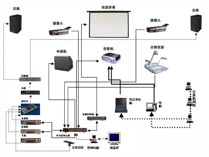 多媒體電教室綜合控制系統是現代化的教學設備。該系統包含了全部電化教學、計算機輔助教學和演示手段,是目前頗受歡迎、便于使用、效果理想的教學演示系統,它將多媒體計算機、多媒體交互白板、多媒體投影機等先進的視聽設備以及其它可遙控設備(如電動幕、中控、音箱等)有機的連接,構 成現代化視聽教學環境。