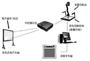 · 交互式電子白板多媒體教室是一種由計算機及相關技術和一些外圍設備所裝備的教室。它至少包含計算機、交互式電子白板(或交互式書寫 屏)、電子課件、視頻展臺、投影機和其他設備(VGA分配器等)。它還可以包含錄像機、視頻/音頻接收設備、網絡連接設備(接入因特網/局域網等)。